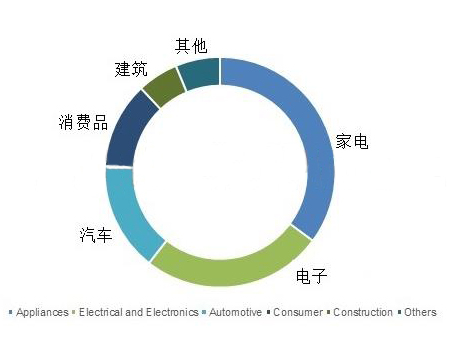 2015年,全世界家用电器ABS使用量占有率在30%之上,处在主导性。因为ABS塑料具备高设计方案协调能力、重量较轻、低成本、抗腐蚀、耐热、阻燃等级高、外型亮丽及其具备优质的机械设备特点,城市化进程和家用电器消費的提升是ABS市场要求猛增的关键要素之一,将来全世界家电业的扩大将为ABS市场的增长造就有益的标准。