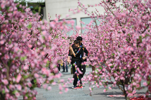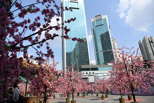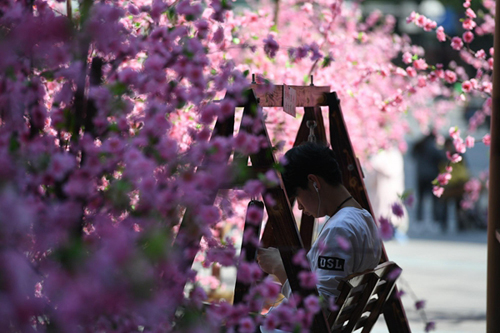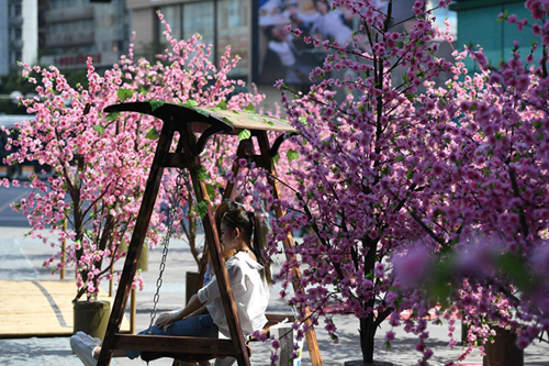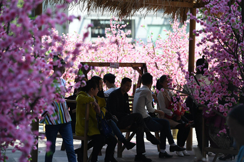 坐落于成都最热闹的盐市口商业服务地区,一大中型网上购物商城为了更好地拉拢消费者,刻意打造出了一副“十里桃花”景色,远观在熙熙攘攘的街边看起来十分壮观。可走入观查,这种“桃花运”、"果树"都是由塑料材料人力打造出而成,但前去赏“花”的市民依然纷至沓来。(2017年4月15日拍攝)