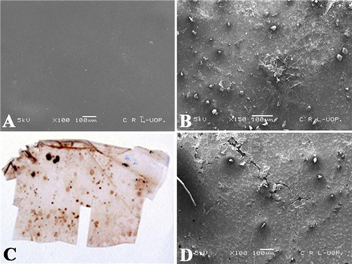 图中表明的是埋藏在土壤层中四个月的聚氨酯材料膜的扫描仪透射电镜相片(A)对比PU膜的SEM,(B)埋在土壤层里一个月的PU膜的SEM,(C)埋在土壤层里四个月的PU膜,(D)埋在土壤层里四个月的聚氨酯材料膜的SEM。