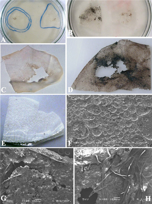 图中能够 表明聚氨基甲酸酯(PU)表层生长发育的塔宾曲霉菌的转变,(A)用塔宾曲霉菌打疫苗并以PU无菌检测膜遮盖的SDA板,(B)在孵育四天后PU膜迁移到MSM琼脂板,及其(C)三周后从MSM琼脂平板电脑上收购 的PU膜,(D)在SDA平板电脑上温育两个星期的降解掉的PU膜,(E)对降解的PU膜D的操纵,(F)对比E的SEM,(G和H)检测D的SEM。