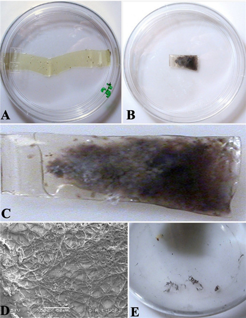 图中则展现了在液體MSM中孵育了三周的PU表层上的塔宾曲霉菌。(A)杀菌PU膜,(B&C)PU膜在具备2%葡萄糖水的液體MSM中孵育二十一天后,(D)在PU膜表层上生长发育的塔宾曲霉菌,及其(E)两月后在MSM物质里融解的PU膜。