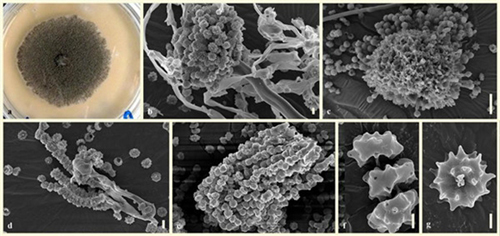 图中表明的是塔宾曲霉菌Aspergillus tubingensis (a)在MEA上塑造20天以后,电子竞技扫描仪图(b)真菌,茎杆和孢子囊(c)孢子囊上未熟的胞子,(d)具备双层构造的分生孢子和孢子囊,(e)孢子囊上的分生孢子(悬壁),(f)分生孢子显示信息叶子网状结构的饰品和副翼为叶子顶端的地球赤道沟,(g)单独分生孢子。