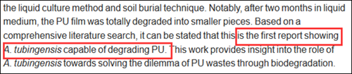 文章简介中尤其标明了课题组“初次发觉 塔宾曲霉菌对PU有降解功效 ”