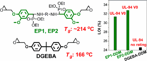 图1 香草醛基性能卓越阻燃环氧树脂构造及与双酚A环氧树脂的特性比照