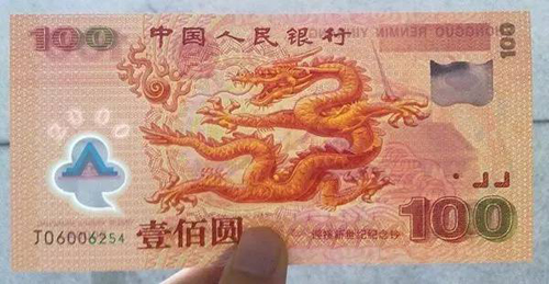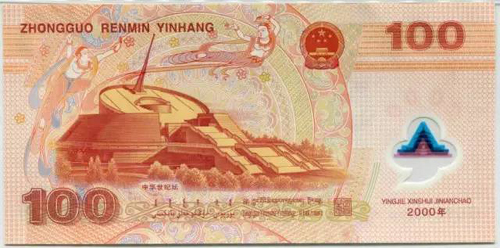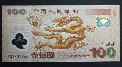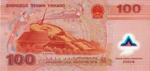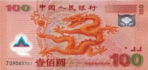 中央人民银行2000年发行的“迎来新时代”一百元塑料纪念钞