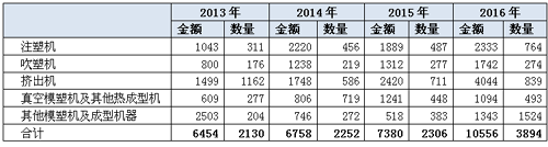 表1 2013-2016年中国塑机出口印度分商品统计分析