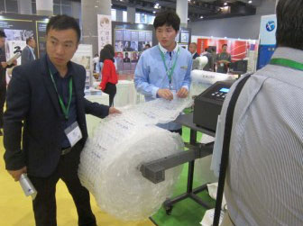 新达这次展览的明星产品之一是打气的缓存包装袋,关键用以货运物流、快递公司包装。