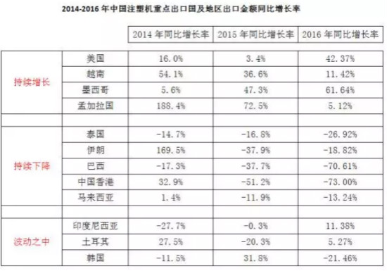 对墨西哥的出口额度持续三年不断下降,下降率不断扩大,2016年降幅达到70.61%,跻身中国注塑机十大出口国之列。
