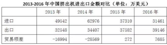 自2015年起中国挤出机进出口完成顺差,2016年顺差值扩张至7685万美元。