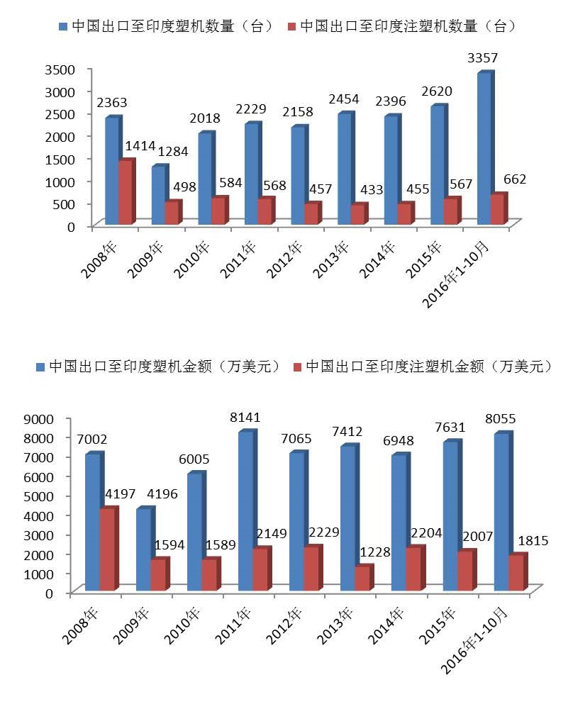 印度是中国塑料机械关键的出口销售市场,虽然自2009年印度对华贸易塑料机征缴巨额反倾销至今,中国对印度的塑料机出口显著降低,但从领域整体看来,中国对印度的塑料机械出口总产量基础维持稳定,实际出口总数、额度如下图所示。