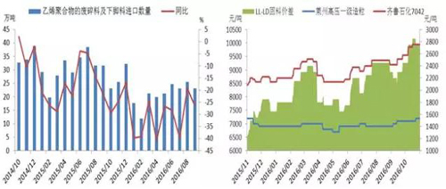 聚乙烯废塑料及下角料出口量也大幅度委缩,数据信息显示信息,2016年1-9月聚乙烯废塑料及下角料進口188.71万吨级,比同期相比降低31.61%。