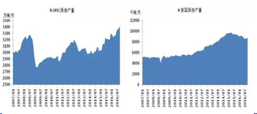 2016年上半年度国际油价超跌反弹反跳,反跳力度超70%,第三季度保持40-55美元/桶区段波动。从石油提供端看来,opec石油产量不断提升,2016年10月opec石油产量升至3402万桶/天,较今年初提升了107.五万桶/天。opec会员国中沙特、伊朗及沙特阿拉伯石油高产比较显著,较今年初各自提升了88万桶/天、十五万桶/天宇33万桶/天。今年初对伊朗制裁消除,沙特石油得到重回国外市场,沙特积极主动高产,不肯冻产,是opec石油冻产协议书不成功的关键缘故。非opec石油产量长期保持,2016年10月非opec石油产量为5742万桶/天,较今年初降低了58万桶/天,在其中美原油产量有很大的下降,2016年10月美原油产量为1453万桶/天,较今年初降低了56万桶/天,但伴随着石油价格超跌反弹反跳,美国页岩油亏本工作压力减轻,美原油产量有止跌企稳征兆。