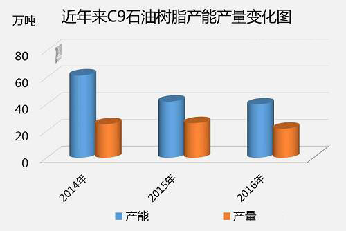 C9石油树脂产能关键遍布在山东省、河南省、东北地区,约占全国各地产能的72%上下。之上地域归属于环保督查的重污染区域,加上处在北京首都附近,且归属于雾霾天气比较严重地区,因而环境保护查验也分外严苛。据中宇资讯数据分析,2016年C9石油树脂产能约为40万吨级,较2014年降低了35%。产能降低符合我国取代落伍产能及其供给侧结构的方针政策。近些年国际性石油价格底位运作,中下游行业要求低迷,C9石油树脂行业生产制造主动性不高,设备闲置不用率提升,故一部分公司卖出机器设备调产其他行业,它是供货产能过剩,要求不够的必然趋势。