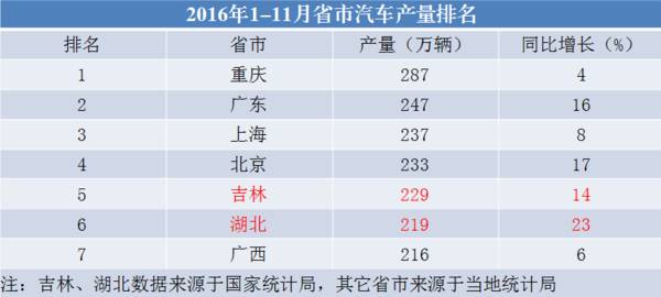 据中国各省市统计分析的汽车产量:1-11月,全国各地汽车产量排名前7位的省市分别是重庆市、广东省、上海市、北京市、吉林省、湖北省、广西省。在其中,6个省市2016年的汽车产量超出200万辆,重庆市全年度汽车产量预估超出三百万辆。