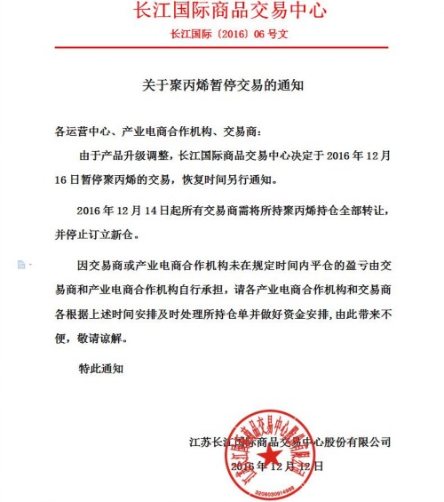 12月14日,江苏省长江国际产品交易中心公布有关聚丙烯中止交易的通告,12月16日起终止聚丙烯交易,14日起交易合同所有强制平仓。该通告原文以下: