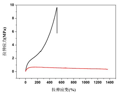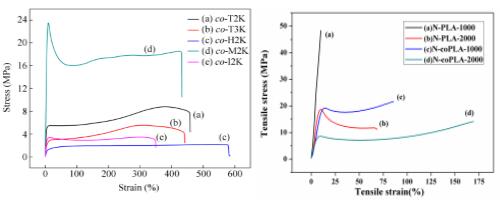图2 聚乳酸聚氨酯的地应力-应变力曲线图:左图为热固性聚乳酸聚氨酯;下图为热固性塑料聚乳酸聚氨酯
