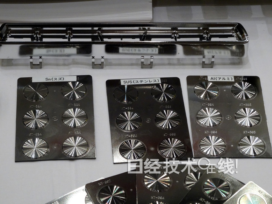 此外,玉川电器还展览了用硬质的树脂在电器产品的按键及把手里主要表现车纹的试品(图1)。制造时先在树脂构件表层产生高宽比为0.05mm上下的内切圆状(车纹)凸凹图案设计,随后历经面漆、金属材料蒸镀及油漆工艺流程来进行。原先存有涂层太厚,车纹被封死的概率,而本次根据开发设计减薄涂层的技术性,完成了与金属材料同样的主要表现水准。