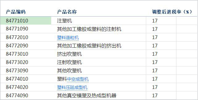 已有人阅读此文 - -据国家财政部公布,各省市、自治州、市辖区、省级城市财政厅官网(局)、国家税局,新疆兵团财务局:经国务院办公厅准许,自2016年11月1日起,提高机电工程、成品油批发等塑胶机械设备以内共418项产品将提高出口退税率,在其中塑胶类现有10项,该10项产品都提高为17%的高档次退税率。