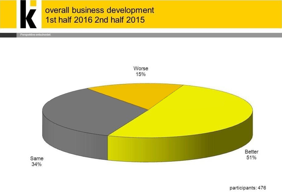 已有人阅读此文 - -2016年上半年度德国塑胶工业发展趋势超出预估。据德国KI (Kunststoff Information)的数据调查报告,在接受访问的公司中,有51%公司销售业绩与上年第三季度对比取得提高。