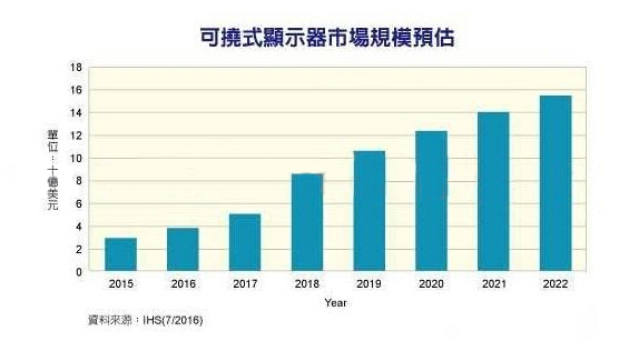 市场调研组织IHS全新预计,到2022年时,可挠式显示器的年产值经营规模将上看155亿美金,与2016年的37亿美金对比,发展力度达到300%。在其中,配戴式设备与行動设备为推动可挠式显示器要求发展的几大模块。