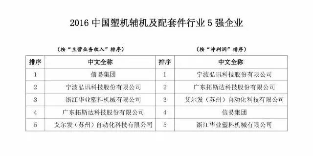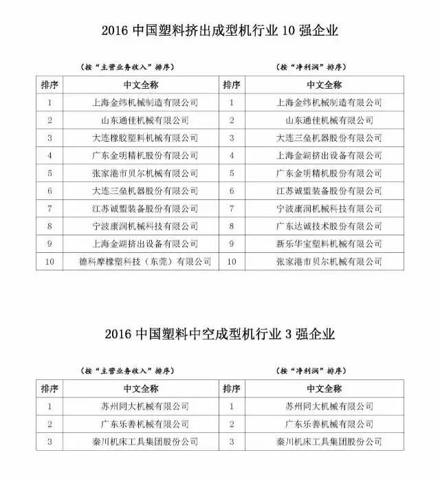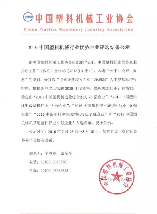 已有人阅读此文 - -由中国塑料机械设备行业协会机构的“2016中国塑机行业优点公司排序工作中”(参照中国塑机协【2016】9号本),秉着“公正、公平、同意”的标准,各自以“主要经营的业务收益”和“纯利润”为指标值开展排序。依据各企业汇报的2015年度材料,经有关部门财务审计和核查,明确出“2016中国塑机加工制造业整体实力25强公司”、“2016中国塑料注入成形机行业15强公司”、“2016中国塑料挤压成形行业10强公司”、“2016中国塑料空心成形行业3强公司”和“2016中国塑机锅炉辅机及配套设施件行业5强公司”当选名册。