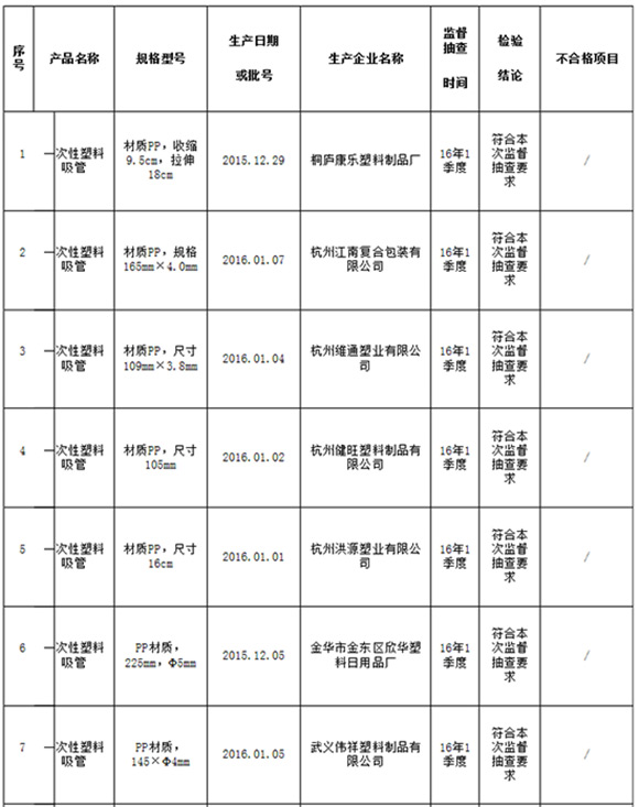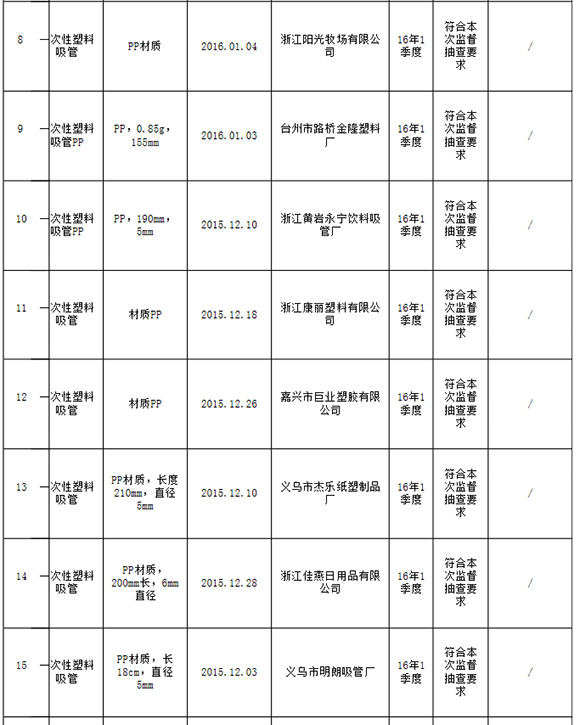 浙江省质监局抽查一次性塑料吸管产品