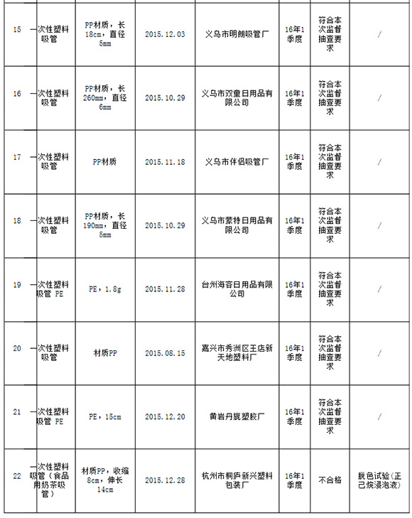 从此次发布的《2016年一次性塑料吸管产品监督抽查结果汇总表》中发觉,杭州桐庐县新起塑料包装厂生产制造的1批号一次性塑料吸管(食品类用奶茶店吸管)被验出褪色实验(正己烷浸泡液)新项目不过关。