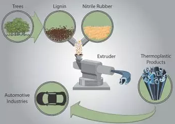 研究工作人员创造发明一项不用有机溶剂的生产工艺流程(用木质素产生木制细胞壁,替代ABS中的丁二烯成份),可联接分散化在丁苯橡胶体里的平等的纳米木质素一部分,使之生产制造可熔可塑易延伸、韧性比ABS强10倍的原材料ABL。