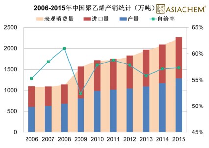 2006-2015年中国聚丙烯产供销状况图2所显示。中国pe过去10总产量和消耗量年平均增长率贴近10%,2007年年增长率贴近16%,但聚丙烯生产量的增速高些,外依赖度呈降低的发展趋势。