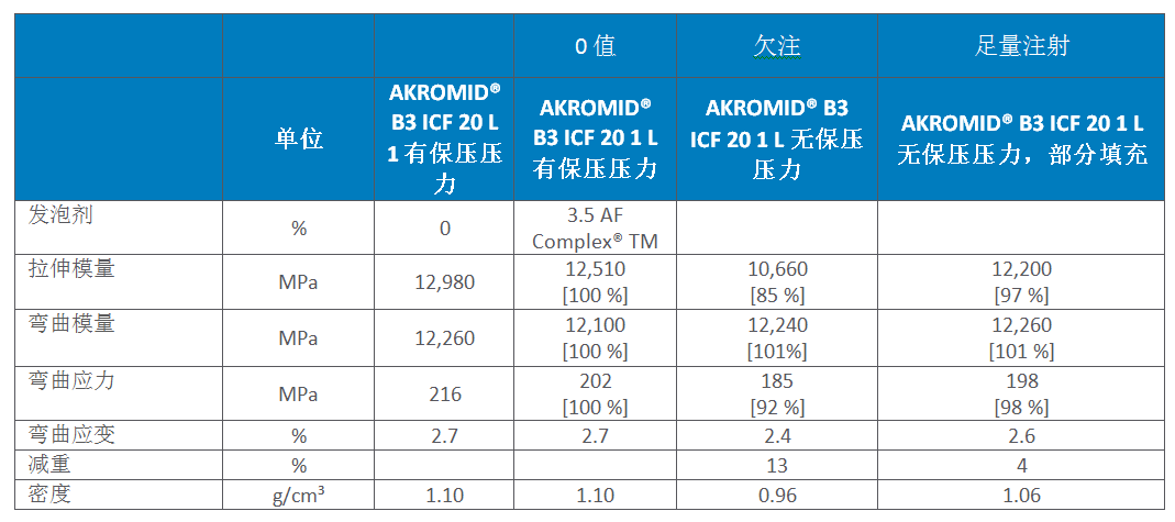 表2.规范加工工艺(添加/不用发泡剂)与欠注/一定量注入加工工艺的较为
