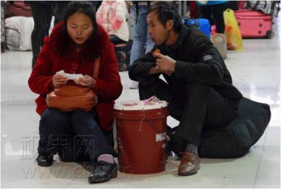 17日中午,夫妻俩从湖南省耒(lei)阳坐火车返回重庆市,为了更好地省下车费,她们选购了最划算的站票。整整的20个钟头的站票時间里,这只塑料桶便是两个人的挪动驿站。