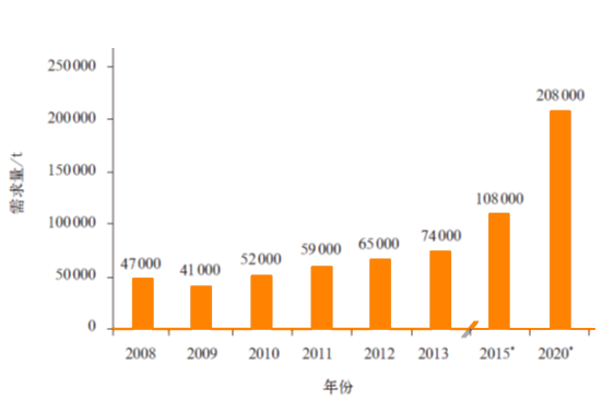图1 2008-2020 年全世界CF 的销售市场需求演革与将来预测