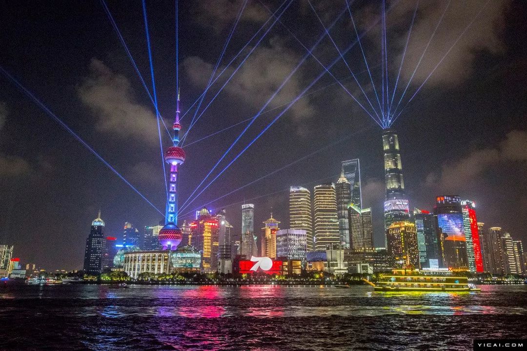 2019年9月29日,中国上海,为了喜迎国庆佳节,上海黄浦江两岸地标建筑上演了精彩的国庆灯光秀,东方明珠电视塔、上海环球金融中心、金茂大厦、上海中心,霓虹璀璨,吸引了诸多市民游客前来观赏,祝福新中国成立70周年。