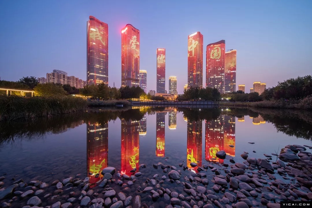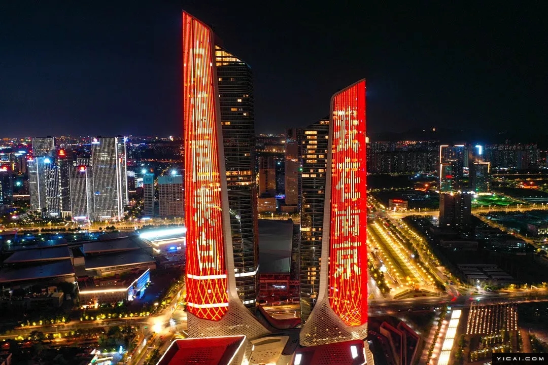 2019年9月20日,江苏省南京市建邺区青奥中心双子塔点亮“向祖国表白”主题灯光秀,楼体上显示“我在南京,向祖国表白”和“点亮人民红,网聚中国心”等巨型汉字,表达对祖国的热爱和祝福之情,庆祝新中国成立70周年。
