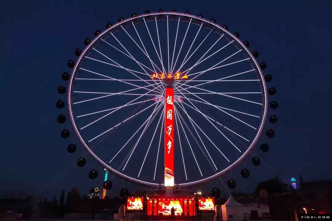2019年9月27日,北京石景山游乐园“我爱你中国”大型主题灯光秀迎来预演,9大景观点位首次同步点亮,由游乐项目改造成的50米高巨型“温度计”也于今日亮相。
