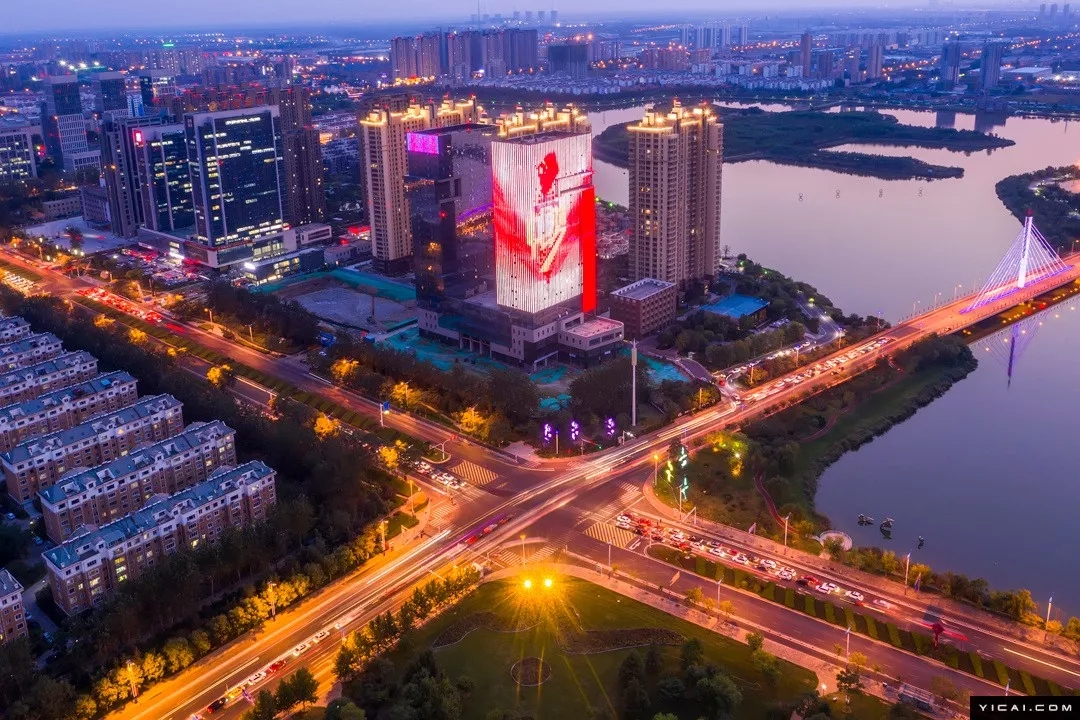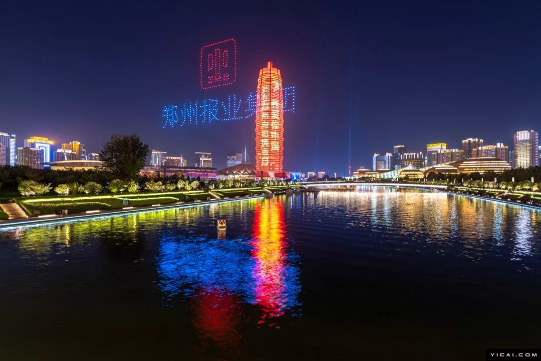 河南省郑州市中央商务区大玉米灯光秀及500架无人机表演点亮郑州。