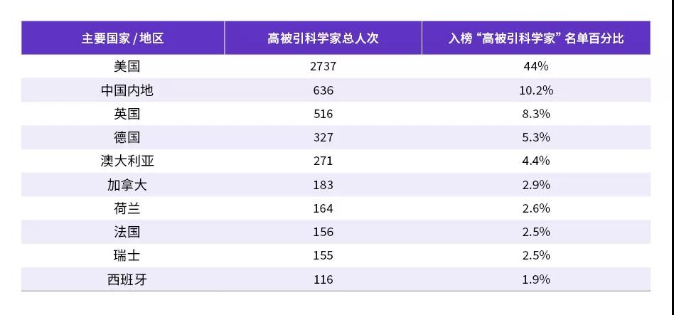美国学者在名单中继续占据主导地位;中国内地取代英国成为第二大“高被引科学家”所在地区。