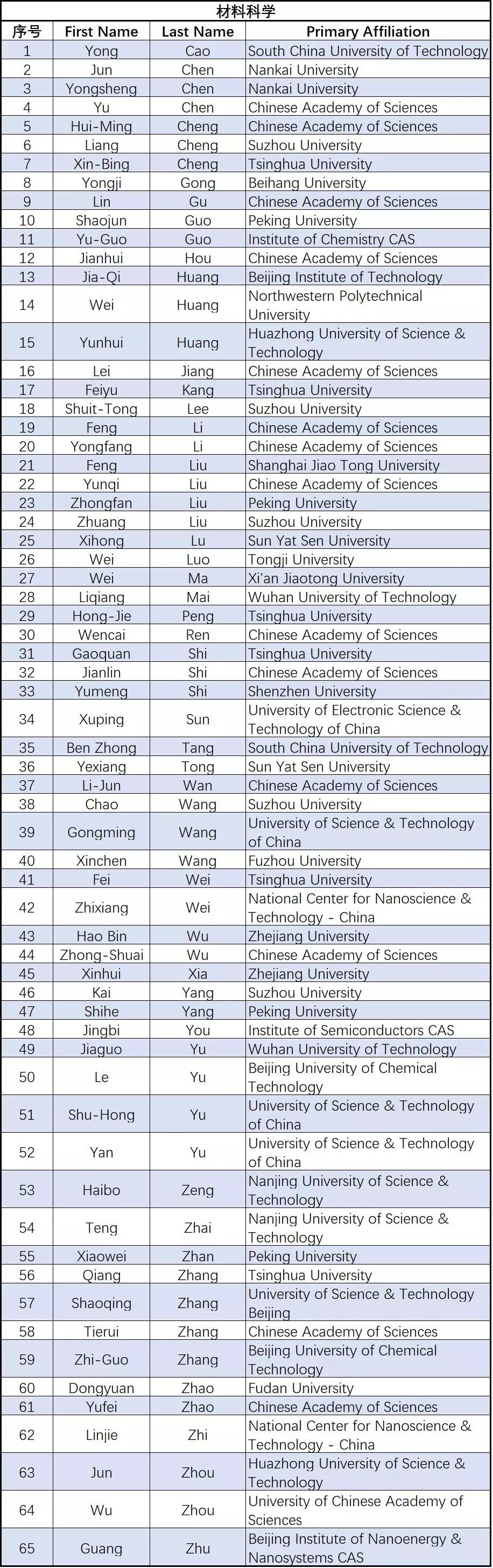 整理了大陆地区化学、材料科学高被引科学家名单,具体如下: