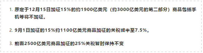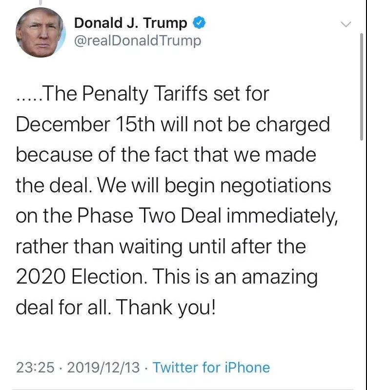 特朗普发推文确认,12月15日原本要加征的关税的确不会再实施。下一阶段的谈判会立即开始,而不是等到2020年美国总统大选之后。