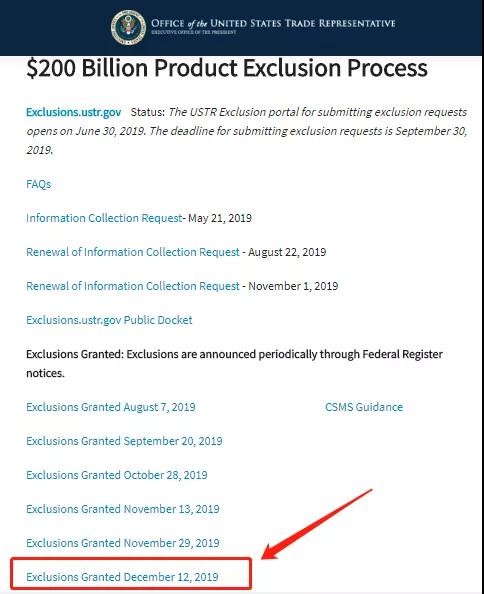 公告及涉及产品下载地址:https://ustr.gov/sites/default/files/enforcement/301Investigations/%24200_Billion_Exclusions_Granted_December.pdf