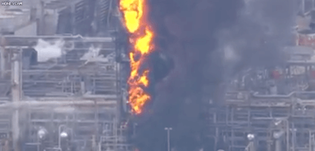 事发工厂上空出现巨大火球,明火照亮了大片区域。在远处的楼房上,仍能听到爆燃声音。有目击者称,当时火势很大,火苗窜起20层楼高。