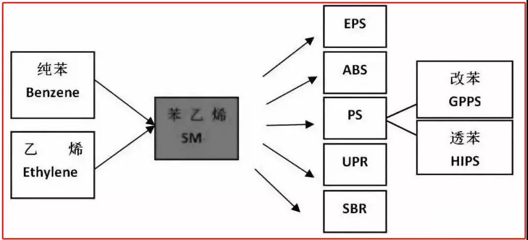 苯乙烯“上承油煤、下接橡塑”,是一种重要的石油化工基础有机原料。苯乙烯的直接上游是苯和乙烯,下游比较分散,涉及的主要产品为发泡聚苯乙烯、聚苯乙烯、ABS树脂、合成橡胶、不饱和聚酯树脂以及苯乙烯类共聚物,终端主要应用于塑料和合成橡胶制品。