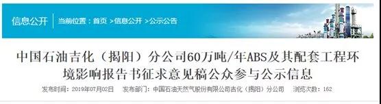 2017年11月28日,中国石油集团公司规划计划部下发《关于在广东石化配套建设ABS 装置相关工作的通知》,要求吉林石化将技术、管理优势与广东石化原料、区位优势相结合,抓紧开展60万吨/年ABS及其配套工程建设,包括60万吨/年ABS、13万吨/年丙烯腈、0.4万吨/年乙腈、5万吨/年甲基丙烯酸甲酯、15万吨/年废酸再生等装置。