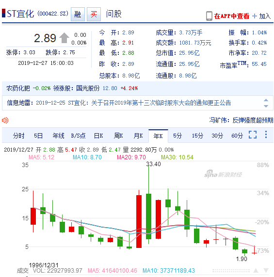 从33.4元/股跌至2.89元/股(截止2019年12月27日,ST宜化股价为2.89元/股)。高管相继落马,被强取豪夺后的湖北宜化只剩残骸。留下的是巨亏77亿的大窟窿!