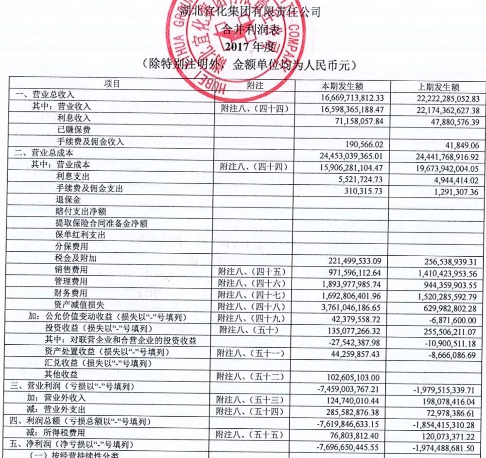 中诚信出具的宜化集团2018年度跟踪评级报告显示,受大面积停产、原材料采购价格上涨,计提停工损失及资产减值损失等因素影响,2017年公司亏损加剧,当年实现净利润-76.97亿元。