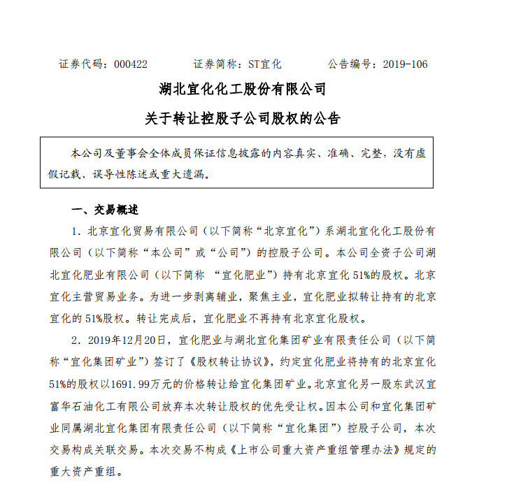 公告显示,2019年12月20日,宜化肥业已与宜化集团矿业签订了《股权转让协议》,约定宜化肥业将持有的北京宜化51%的股权以1691.99万元的价格转让给宜化集团矿业。北京宜化另一股东武汉宜富华石油化工有限公司放弃本次转让股权的优先受让权。因本公司和宜化集团矿业同属宜化集团”控股子公司,本次交易构成关联交易。