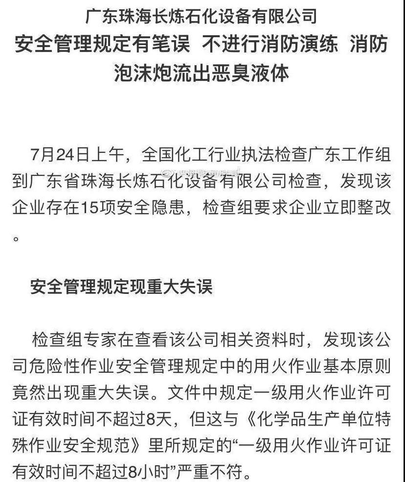 当时报道称,当天检查组在查看珠海长炼石化设备有限公司相关资料时,发现该企业危险性作业安全管理规定中的用火作业基本原则出现重大失误。文件中规定一级用火作业许可证有效时间不超过8天,但这与《化学品生产单位特殊作业安全规范》里所规定的“一级用火作业许可证有效时间不超过8小时”严重不符。