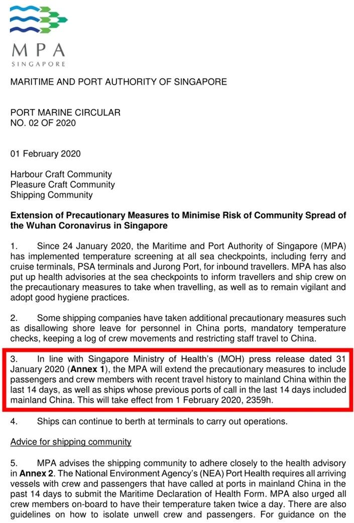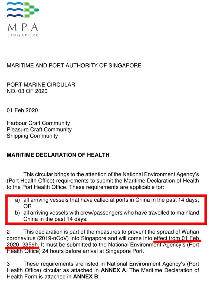 新加坡海事及港口管理局(MPA)2月1日发布通知称,依照新加坡卫生部此前发布的相关规定,MPA将会对过去14天内前往中国大陆的旅客和船员,以及在过去14天内曾在中国大陆停靠过的船舶,实施更加严格的预防措施,增加检疫流程,但不影响船舶靠泊作业。