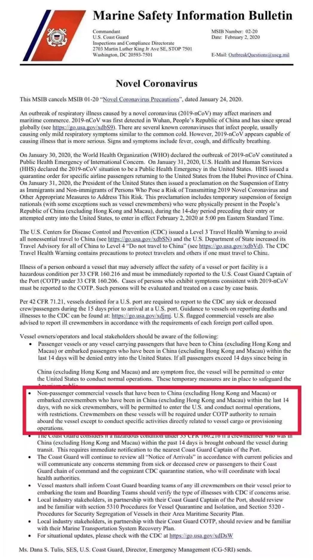 3、卫生当局还建议,如果有人怀疑国际航行中的任何船员或乘客可能患有传染病或类似的2019-nCoV冠状病毒症状,应立即通知健康部门。在这种情况下,卫生官员将提供相应的指示,但疑似病例必须隔离(在船上的船舱或岸上的旅馆),等待相关指示。