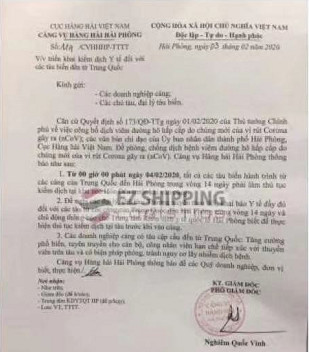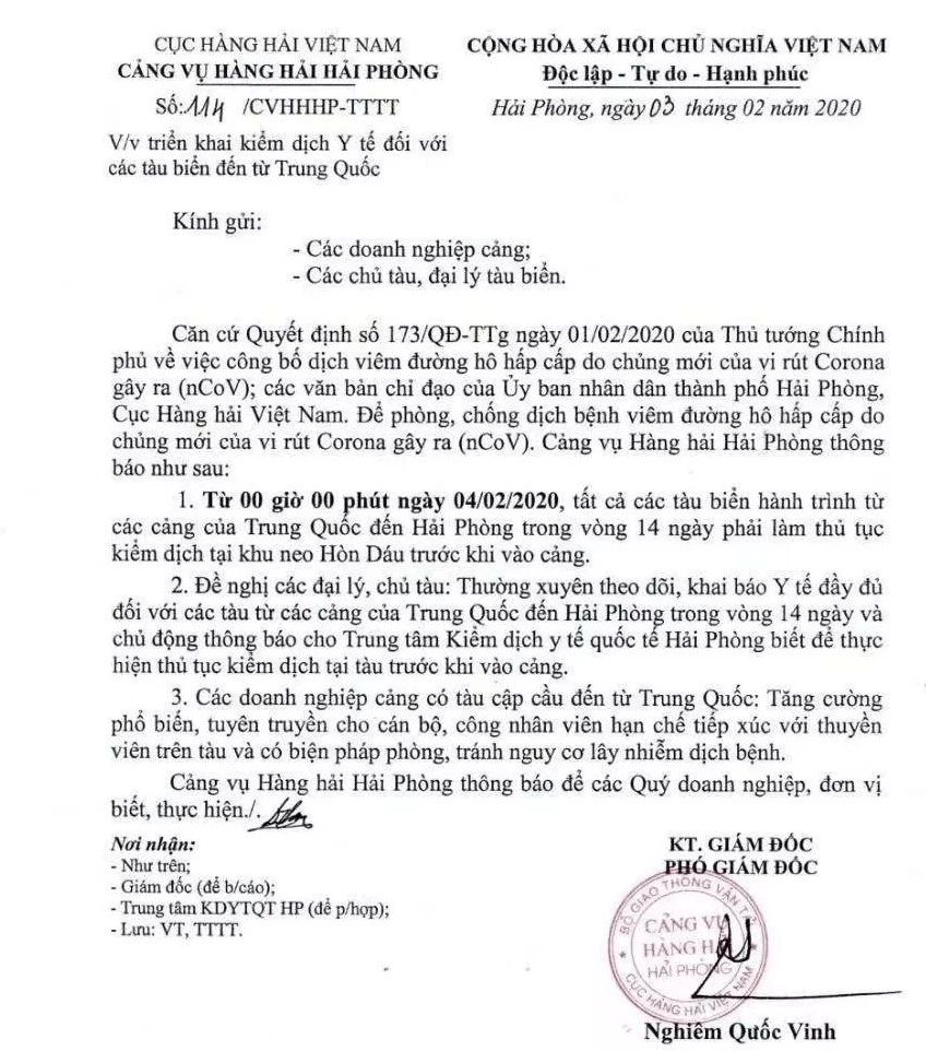 越南卫生部发布公告,在海防港口,将对来自中国等新型冠状病毒高发国家的船舶,采取一系列管控措施!以避免病毒通过船舶等形式输入越南,船舶必须在特定的地方抛锚检测隔离14天后才能靠港。 -